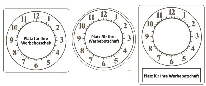 Die Handhabung ist sehr einfach: Innen die Windschutzscheibe gründlich an der Stelle reinigen, an der die Folienparkscheibe angeklebt werden soll. Das weisse Schutzpapier der Folie abziehen, ankleben und mit einem trockenen Tuch glattstreichen. Sodann Schutzpapier der Zahlenscheibe abziehen und so anbringen, dass die Ziffern und Stundeneinteilung im Klarsichtfenster erscheinen-fertig! Bei Bedarf kann die Parkscheibe rückstandsfrei abgezogen werden! Die Parkuhren sind sehr kostengünstig bei höheren Auflagen und Werbeeindruckmöglichkeit für alle Branchen und Vereine. Diese individuelle Parkuhr kann auch mit Fotos kombiniert werden.Diese hohe Qualität wird nur von uns hergestellt und bewährt sich bereits tausendfach. Sie ist wahlweise in eckiger oder runder Ausführung erhältlich. Die Klebeparkuhr ist das ganze Jahr über im Blickpunkt des Puplikums und das ein Autoleben lang! Neben Autohäusern und Vereinen zählen auch Versicherungen und Bankinstitute zu unseren Dauerkunden.